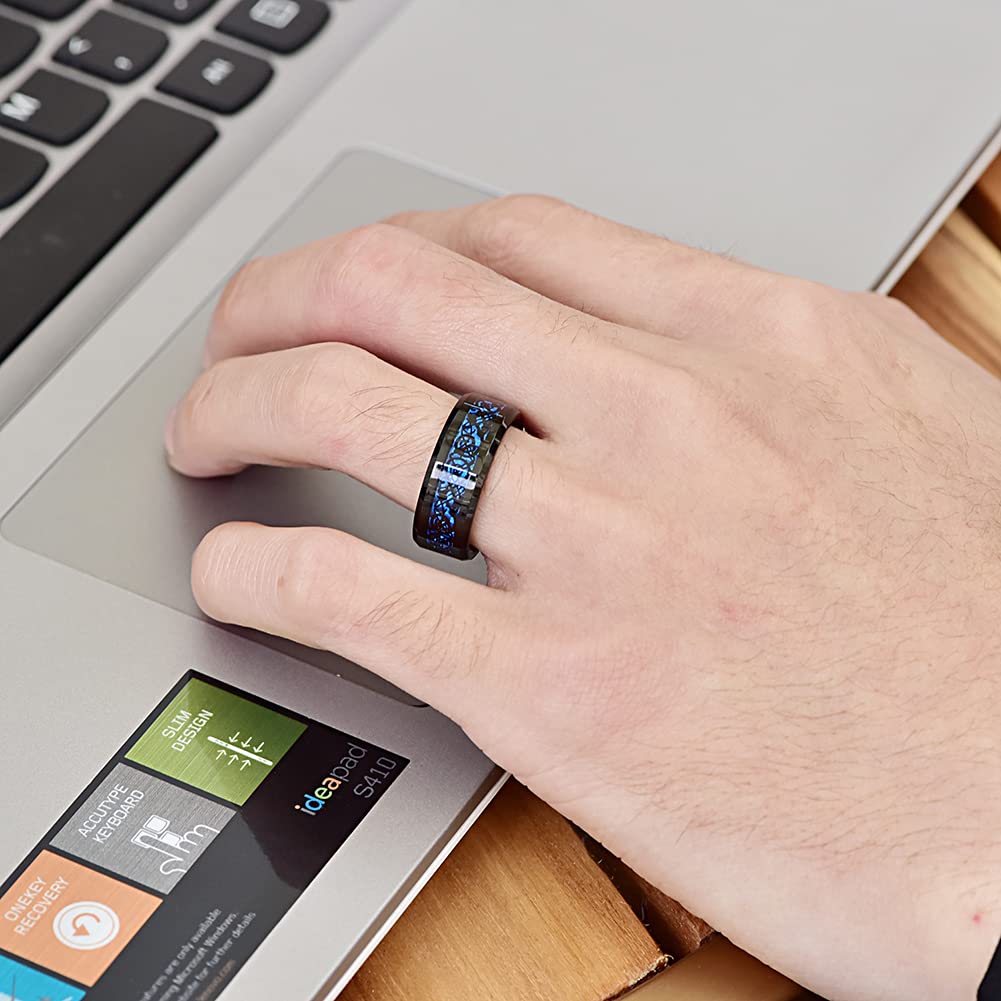 Schwarzer Wolfram-Ring mit keltischen Drachen für Männer: Blau Kohlefaser Poliert (8mm)