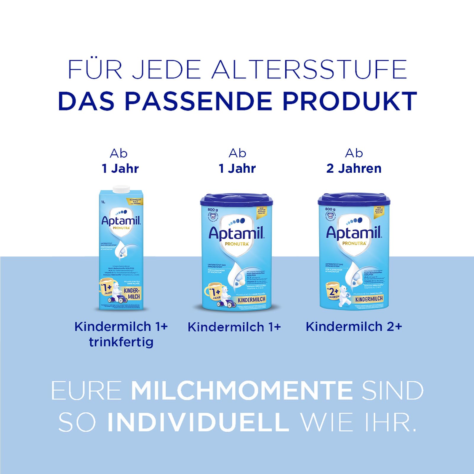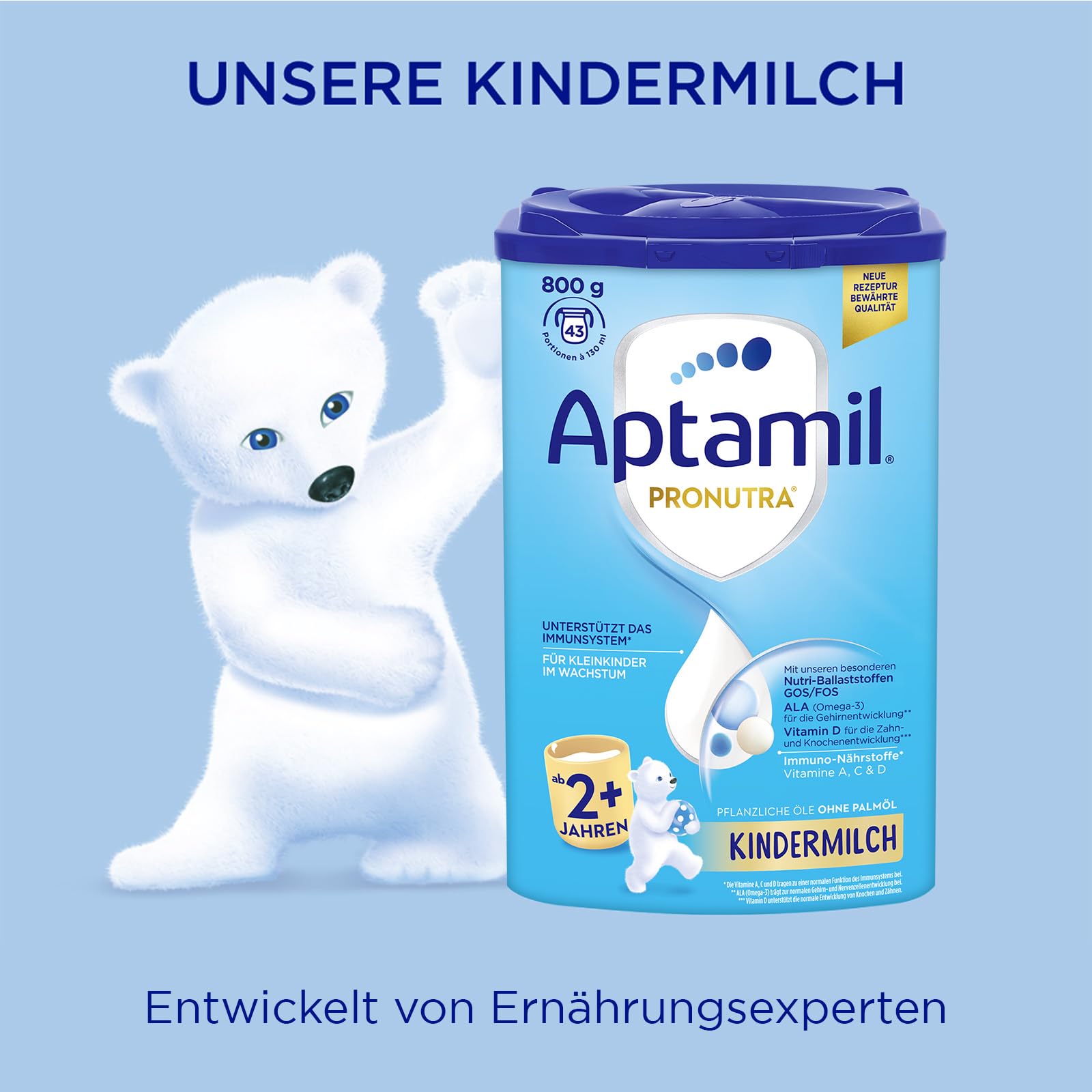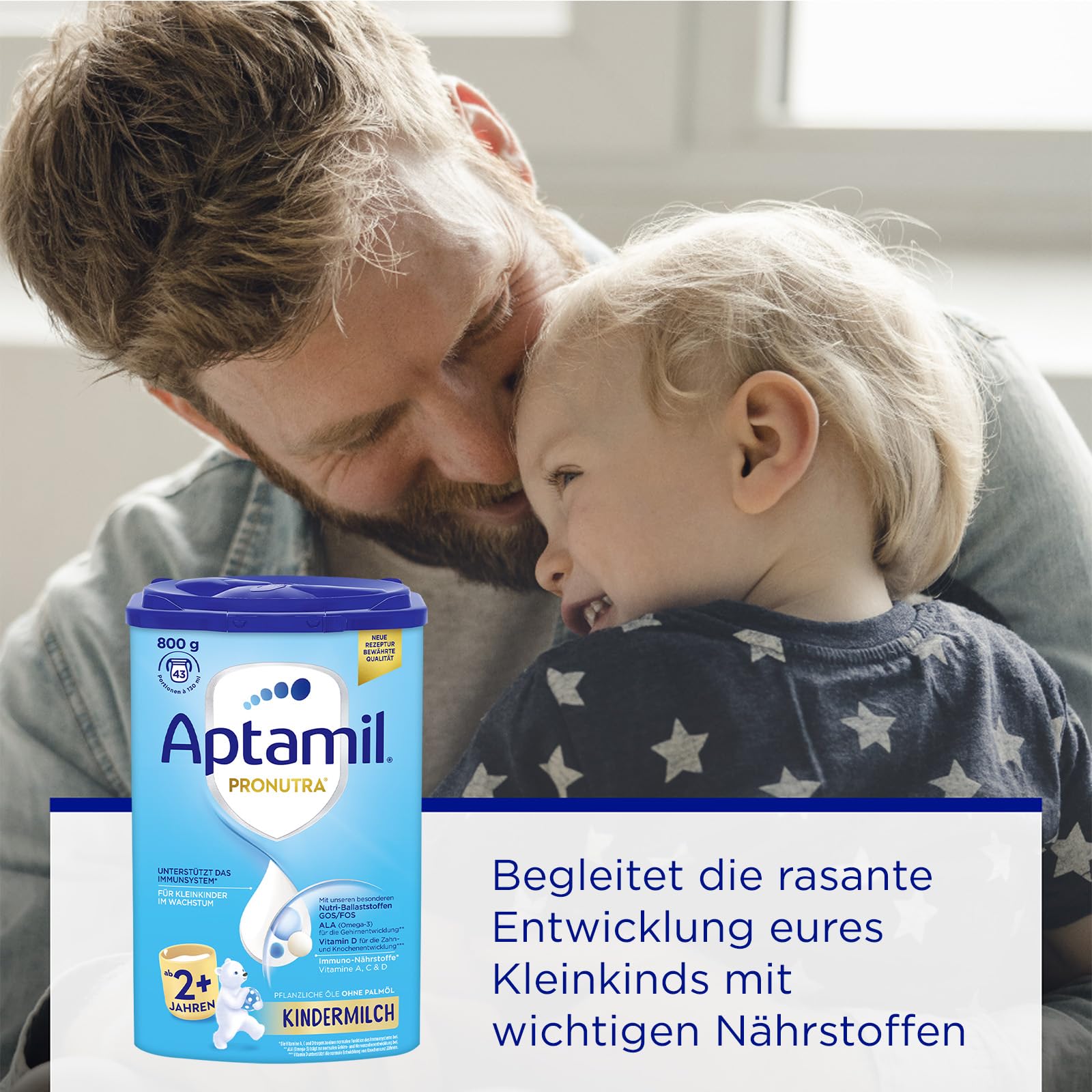 Aptamil Children's Milk 2+ is specially developed for toddlers from 2 years of age - with vitamins A, C & D for the immune system, iron for cognitive development and Omega-3 (ALA) for the brain and nerves.