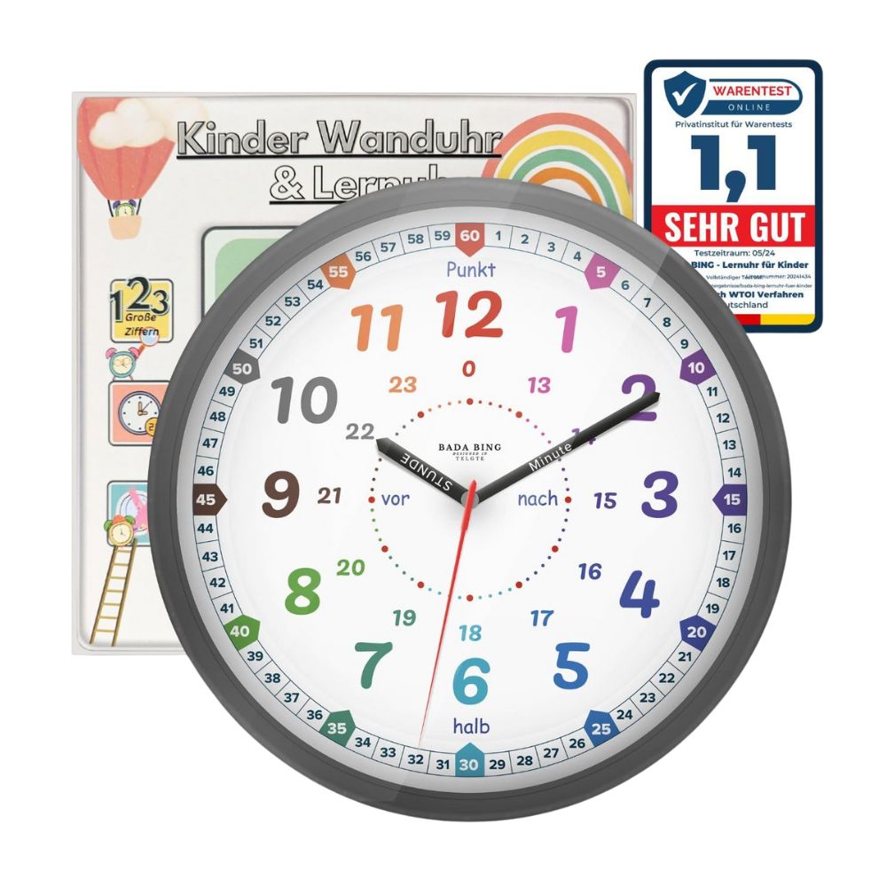Bada Bing Montessori wall clock for children with shatter-proof acrylic glass panel: learning clock without ticking noises