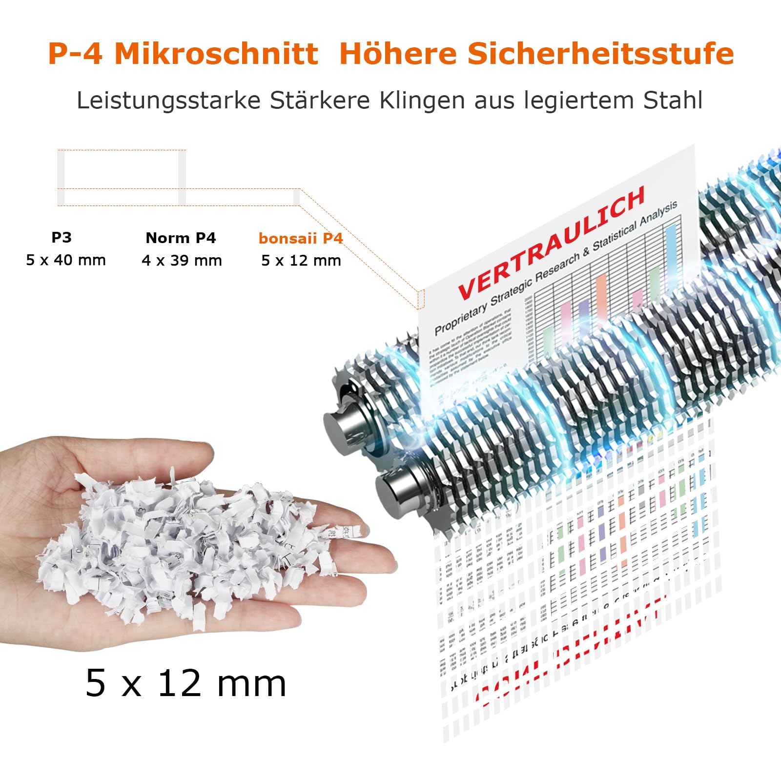 - [P-4 High Security Level] Micro-cut shredder for office use, shreds not only 12 sheets at once into tiny 5 x 12 mm particles, but also CDs, credit cards, emails, staples, and paper clips. Maximum security for your sensitive information.