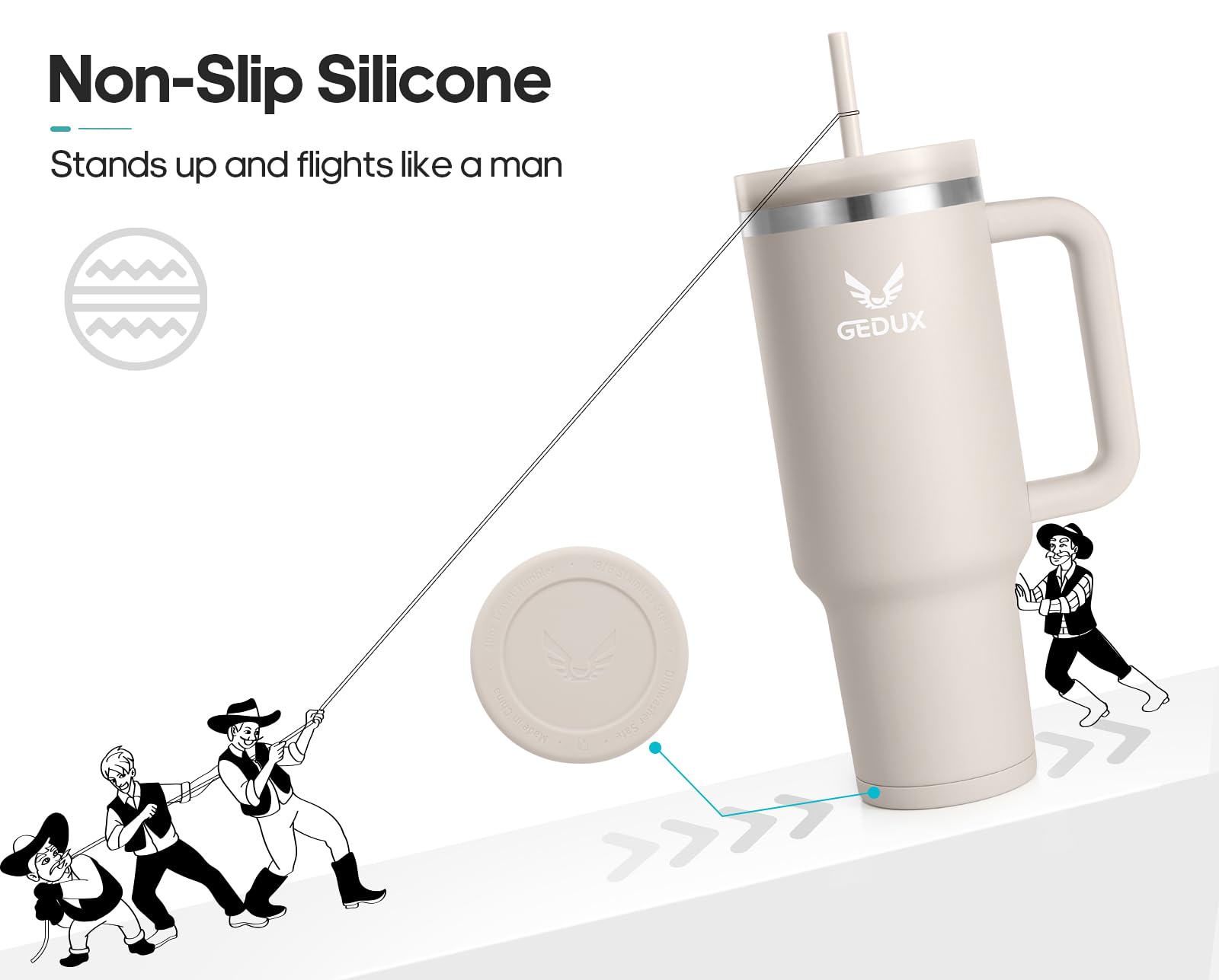 The Gedux insulated mug combines function and convenience with a 2-in-1 lid (straw or drink straight from the mug), vacuum insulation made of high-quality 18/8 stainless steel (24h cold / 12h hot), and a non-slip silicone base . Ideal for on-the-go, it's dishwasher-safe, features an ergonomic handle, and is compatible with car cup holders.