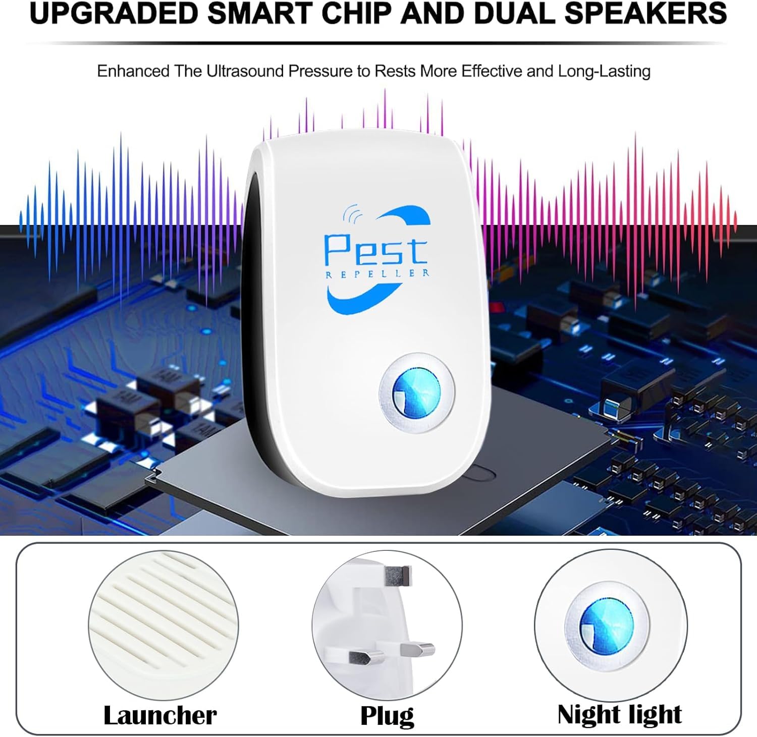 Improved Ultrasonic Technology: Combines ultrasonic and electromagnetic chips that disrupt and repel the auditory and nervous systems of pests such as mice, cockroaches, ants, spiders, parasites, mosquitoes, flies, and fleas .