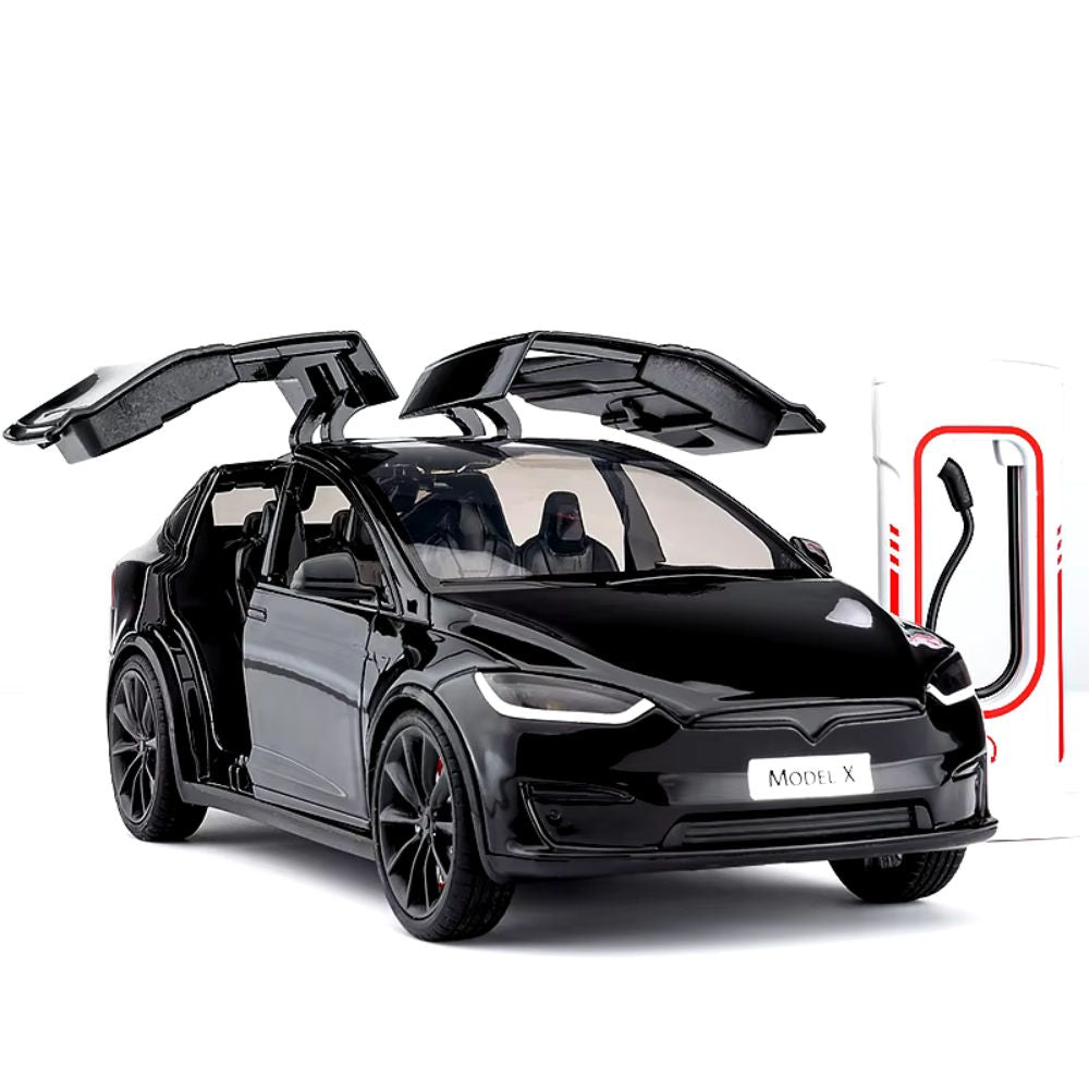Tesla Model X (1:24) Spielzeugauto mit Licht & Sound | Inkl. Ladestation: Sammler-Geschenk (Schwarz)