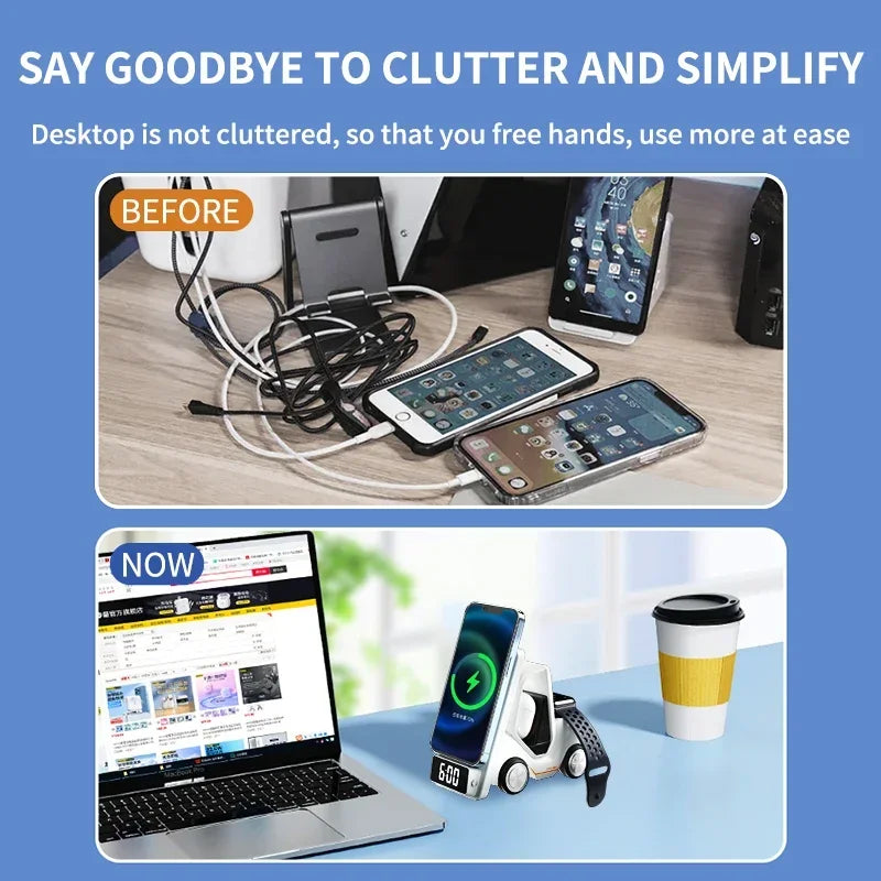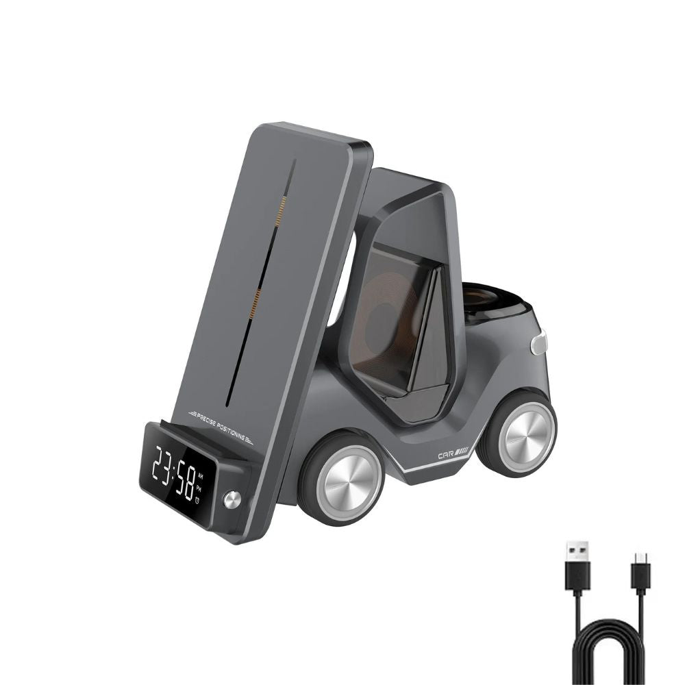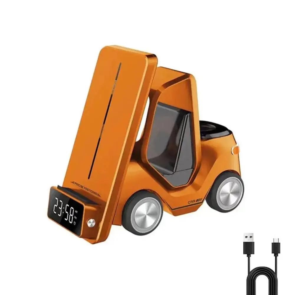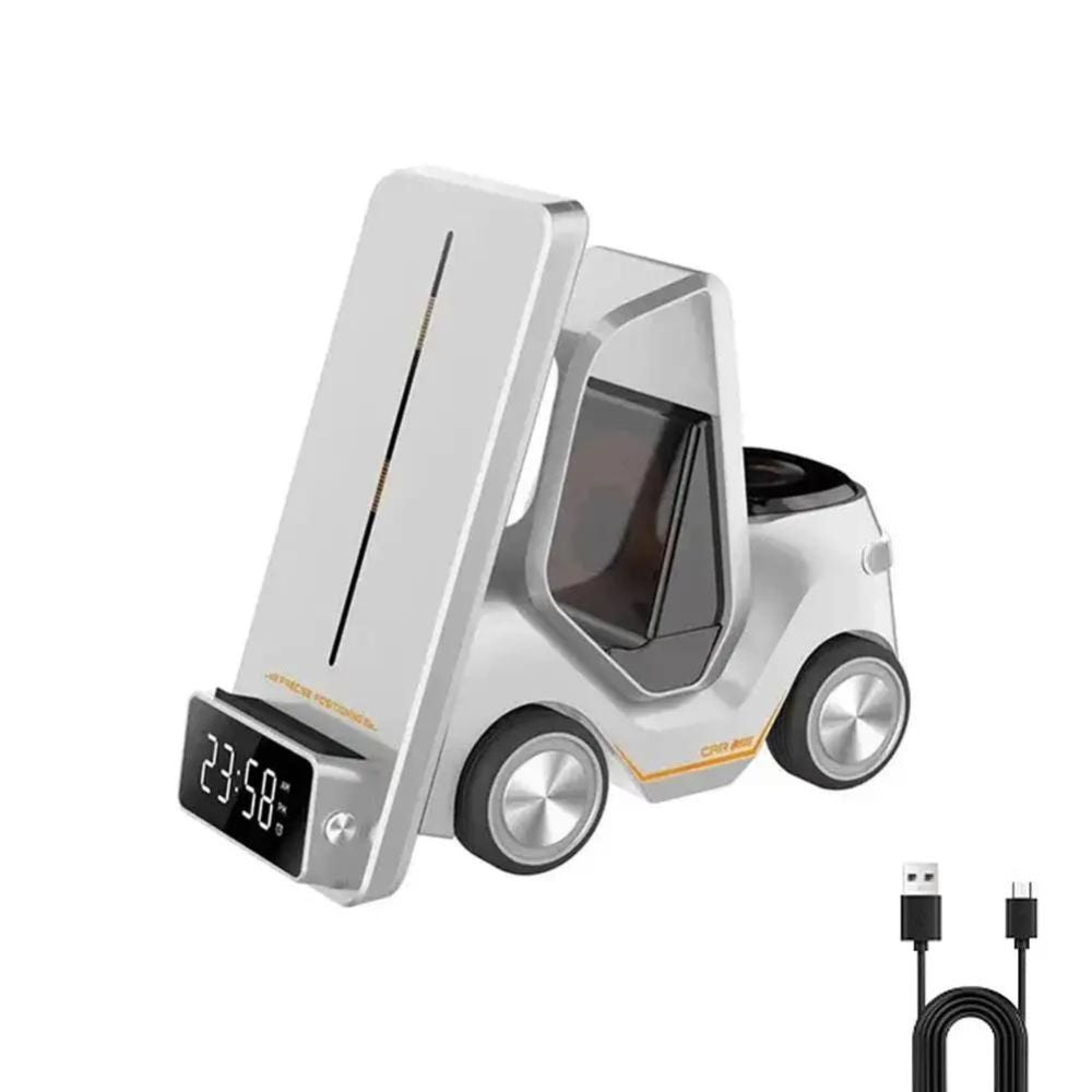 Entdecken Sie die ultimative 5-in-1 Wireless Lade- und Weckstation in Gabelstapler Design - die perfekte Ergänzung für Ihren modernen Lebensstil.