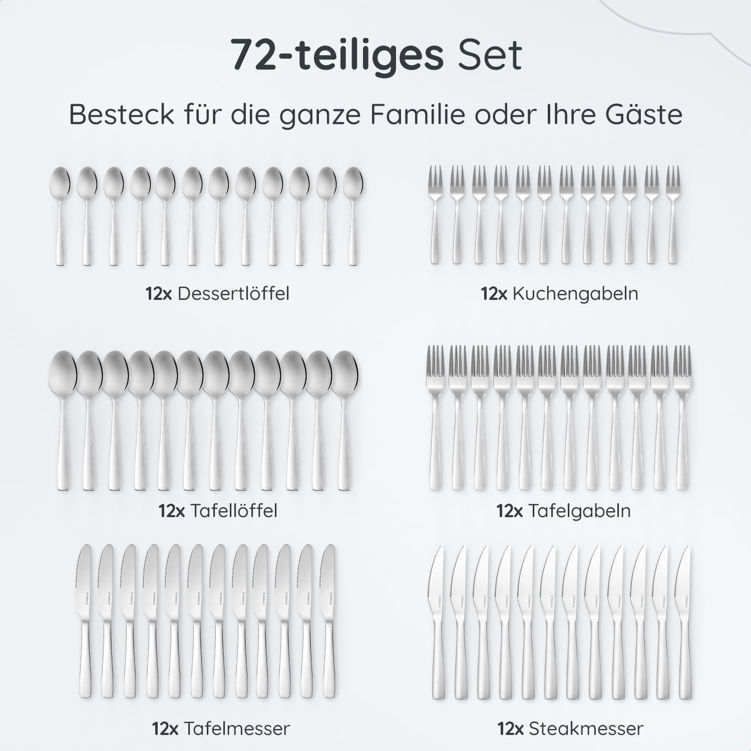 Deleca Edelstahl Besteckset für 12-Personen (72-teilig): Spülmaschinenfest, Silber-Tafelbesteck für Haus